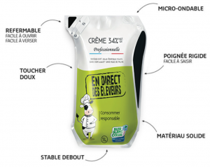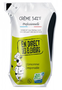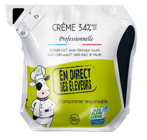 La crème En Direct Des Éleveurs labellisée Bleu-Blanc-Coeur. La crème et le lait Bleu-Blanc-Coeur proviennent de vaches nourries avec de l’herbe, des graines de lin, de la luzerne… Grâce à cette alimentation saine, les vaches sont en bonne santé et produisent un lait de qualité, qui donne une crème UHT professionnelle à la saveur et au goût uniques. De plus, elles dégagent moins de méthane, d’où un impact réduit sur l’environnement.